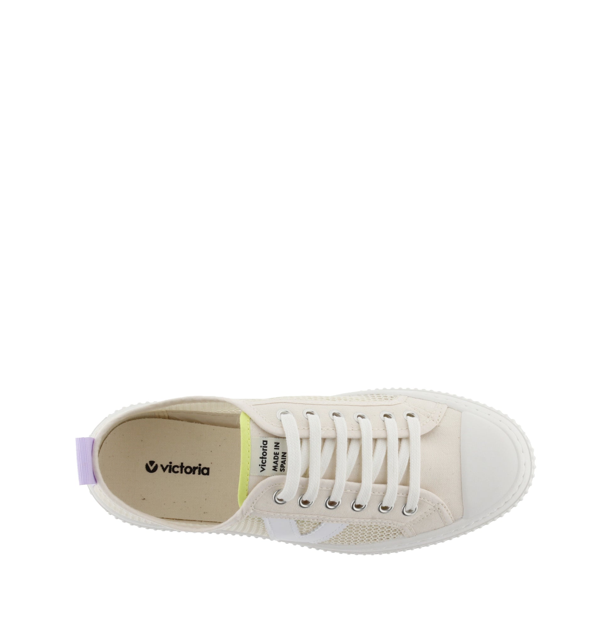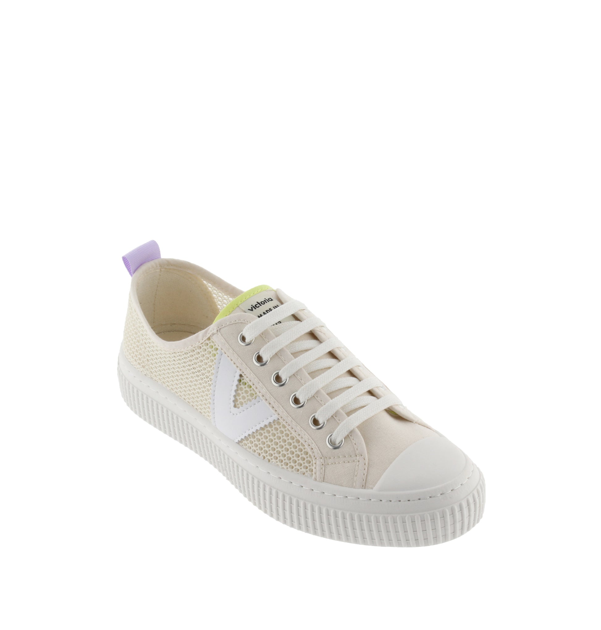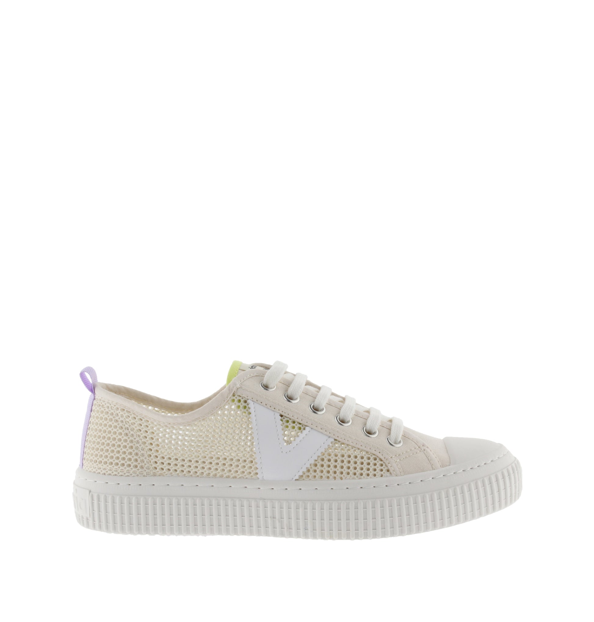 Mesh sneaker with side V and neon detailing at the pull tab and tongue.Eco-friendly cotton, with a 2 cm platform sole made with a vegetable oil rather than mineral oil composition, reducing our environmental impact.