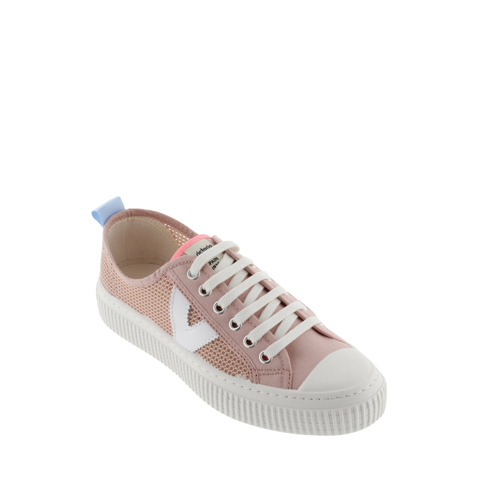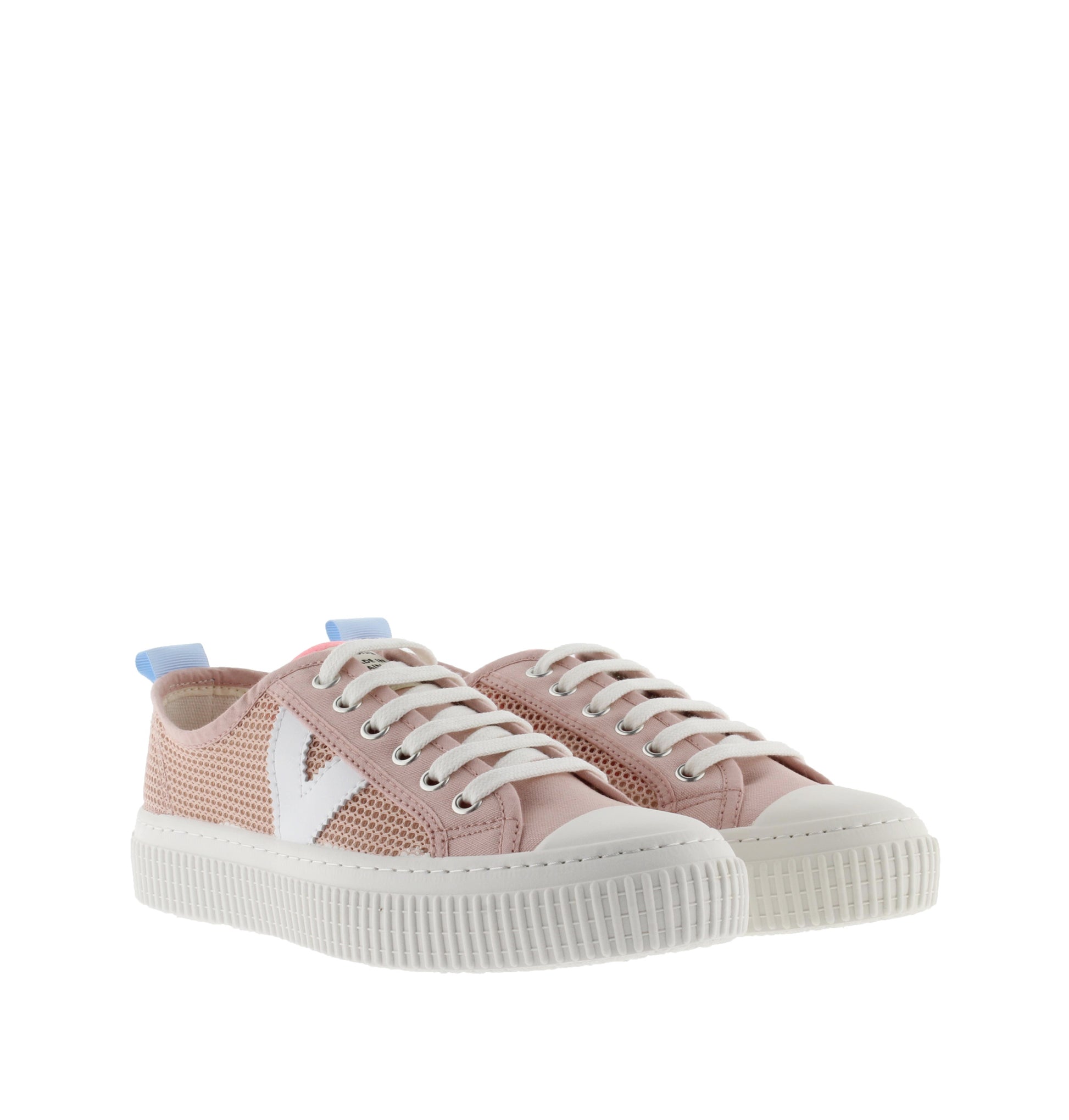 Mesh sneaker with side V and neon detailing at the pull tab and tongue. Eco-friendly cotton, with a 2 cm platform sole made with a vegetable oil rather than mineral oil composition, reducing our environmental impact.