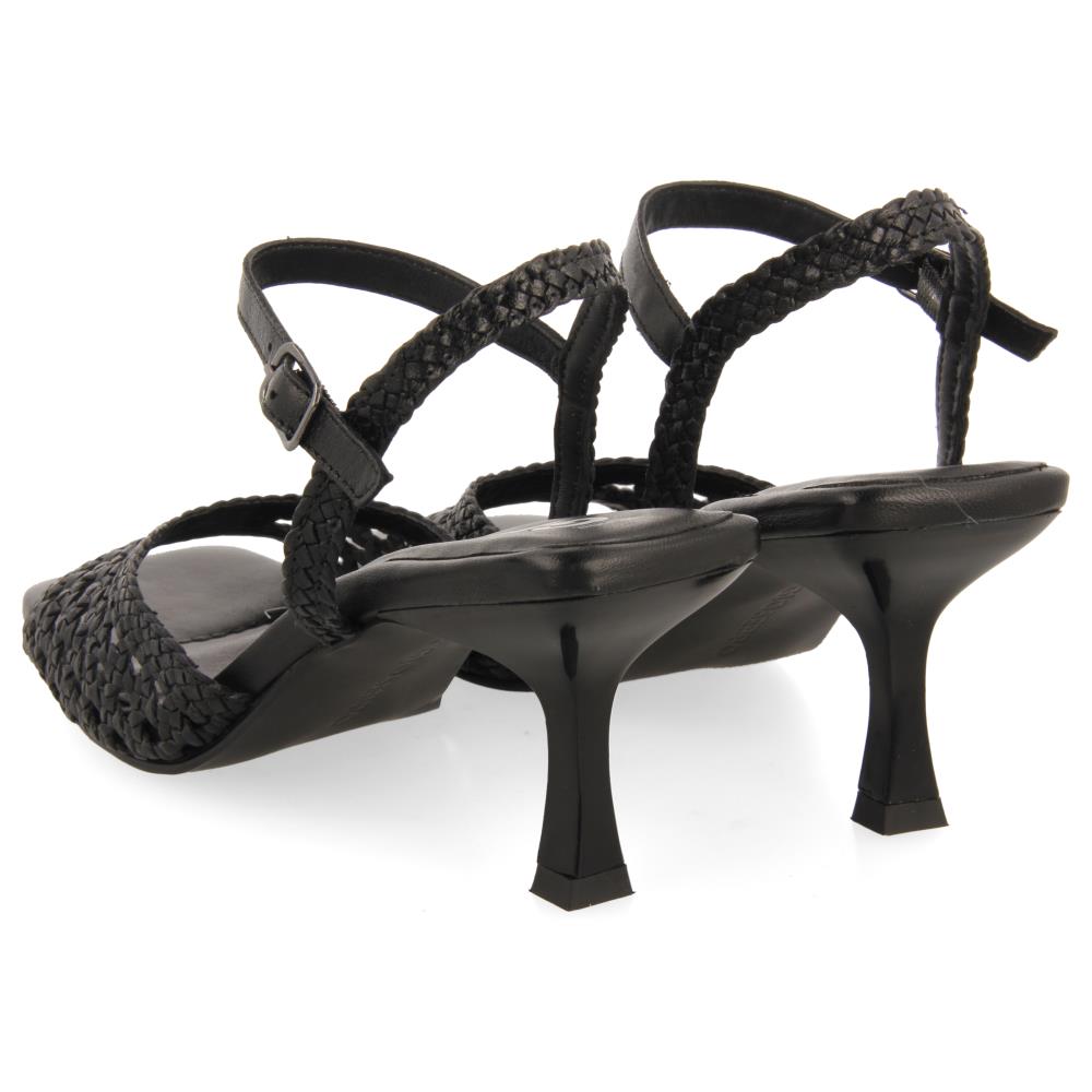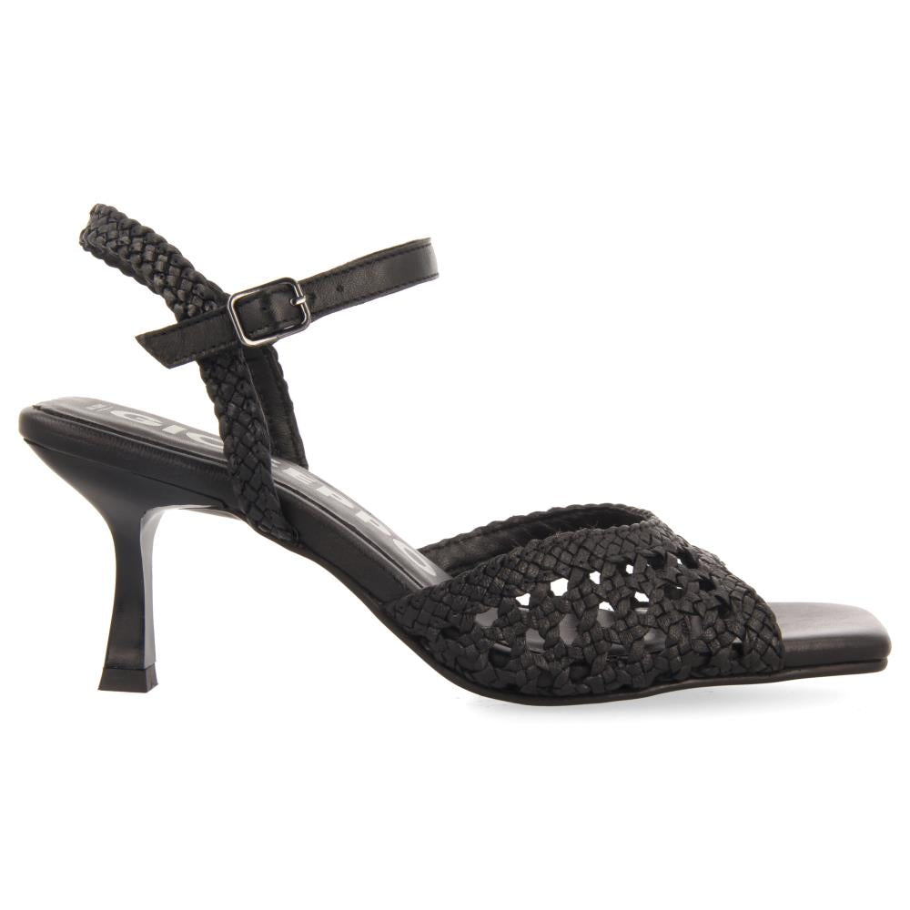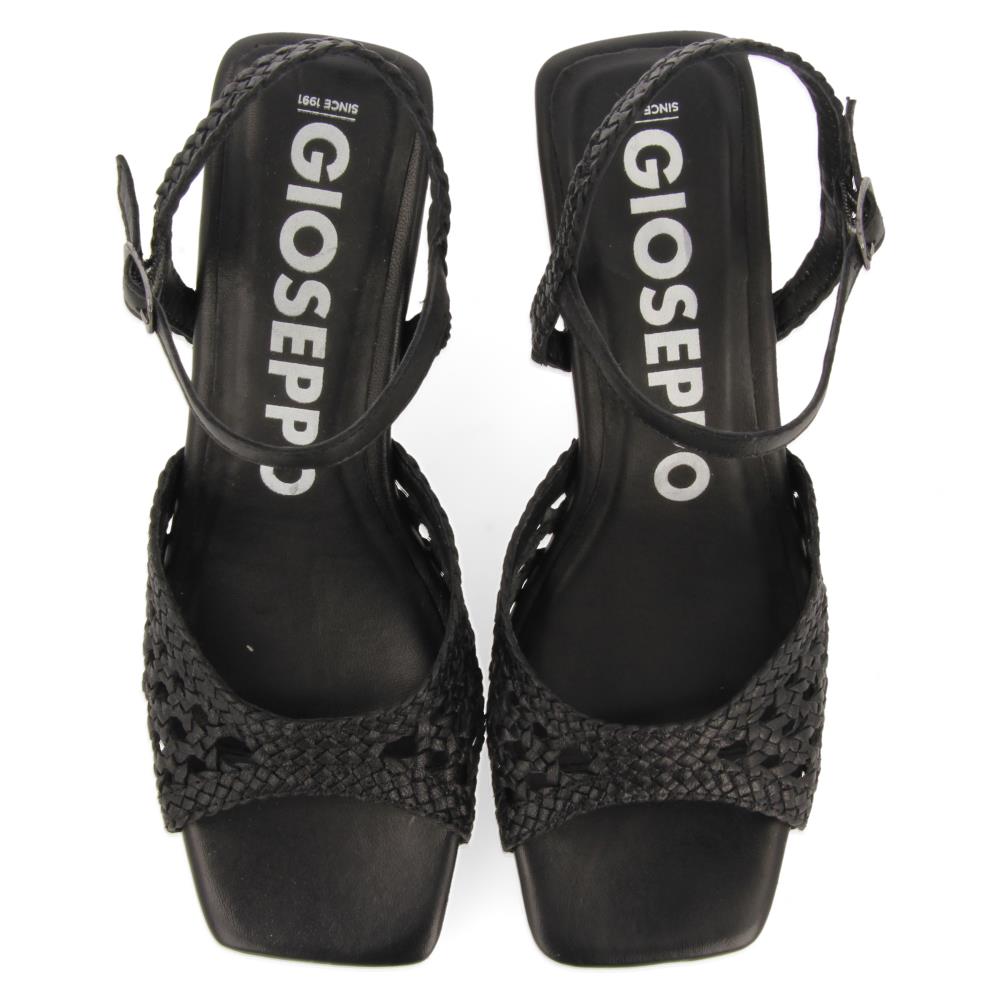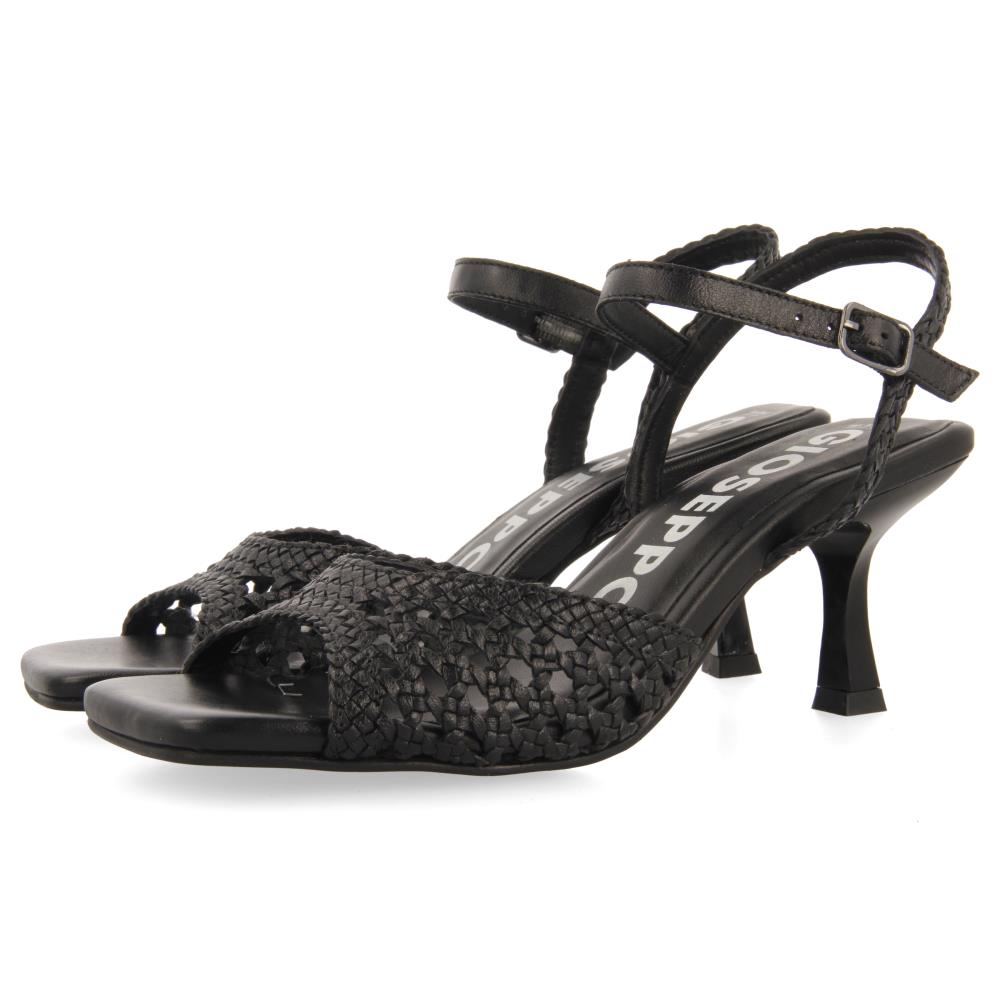 Black leather sandals with braiding and adjustable closure at the ankle.