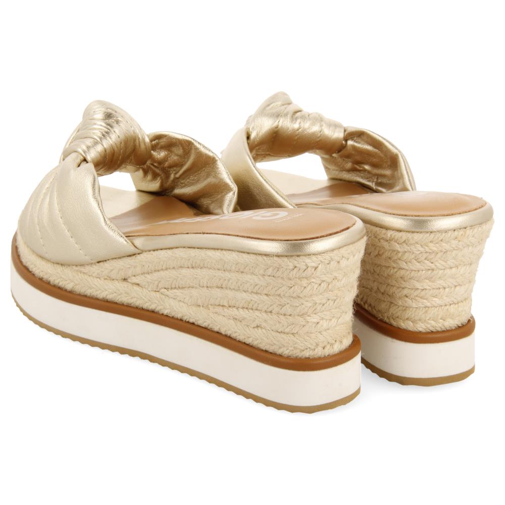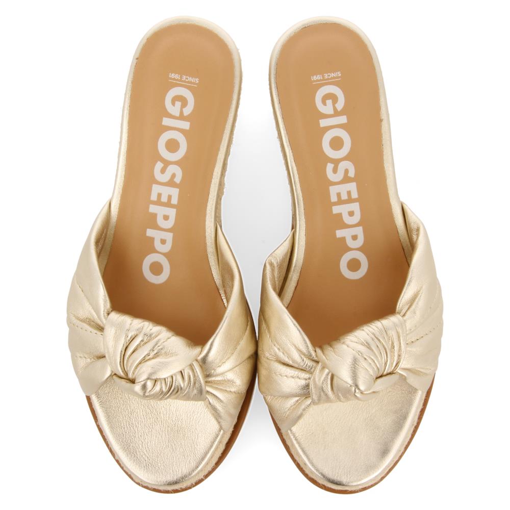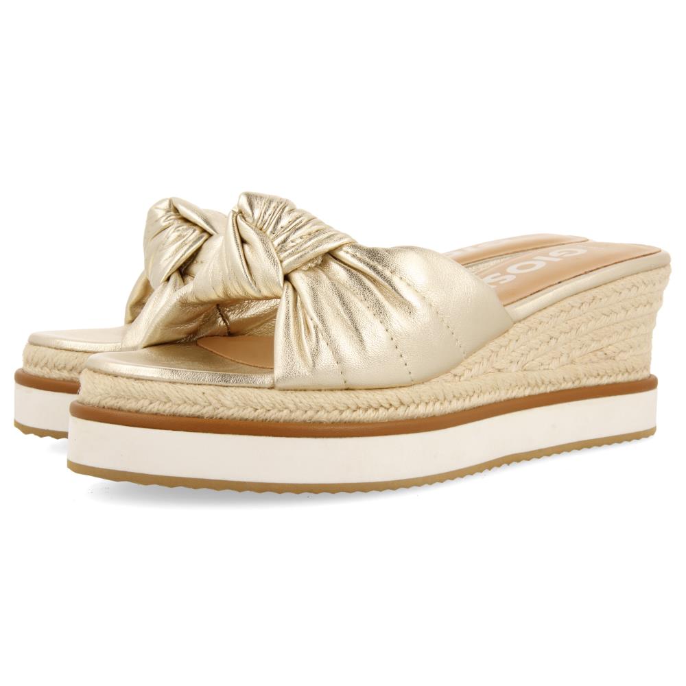 Light and ultra comfortable: Platinum-colored slide sandals with knot detail.